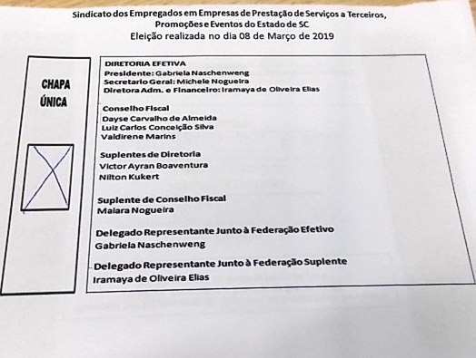 No dia 8 de março, das 9 ás 17 horas, os associados do SINDEPRESC votaram e escolheram a nova diretoria do Sindicato. Gabriela Naschenweg foi eleita novamente presidenta do SINDEPRESC. Junto com uma equipe de trabalhadoras e trabalhadores ela irá representar a categoria nas lutas pelos direitos e benefícios de todos e todas.